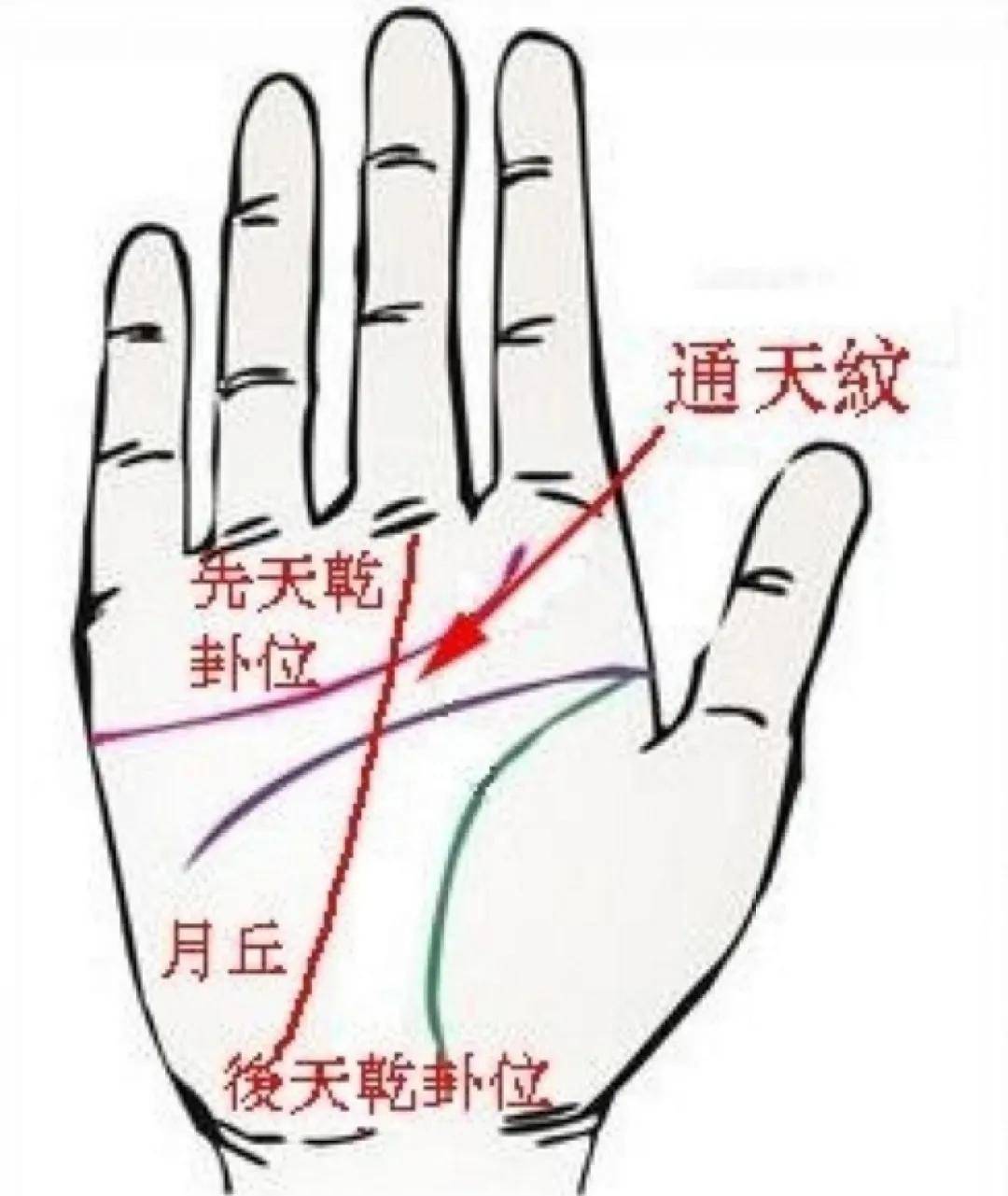 整个手上都有不同的纹理,有些纹理很特别,也预示着命主的不同命运。所谓通天纹是指中指以下的先天茎位,而月亮山是后天的茎位,正所谓“茎即天”,所以事业线从月亮山开始,到终点中指下方称为通天纹。与天纹沟通的人,第六感很强,常能与“天”和“地”沟通,终生佩服金钱。