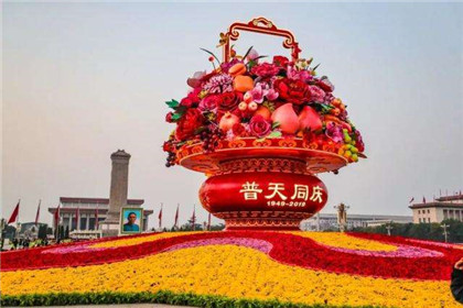 国庆节前夕,大型花坛将被放置在天安门广场的中心。中央大型花坛名为“祝福祖国”,花篮内插有牡丹、木兰、芙蓉花、玫瑰等花卉,平面部分由如意图案的花朵组成,象征财富、吉祥、和平、幸福。花篮表面嵌有中国结图案和中国梦字。花坛直径50米,花篮最宽处15米,最高处15米。福神: